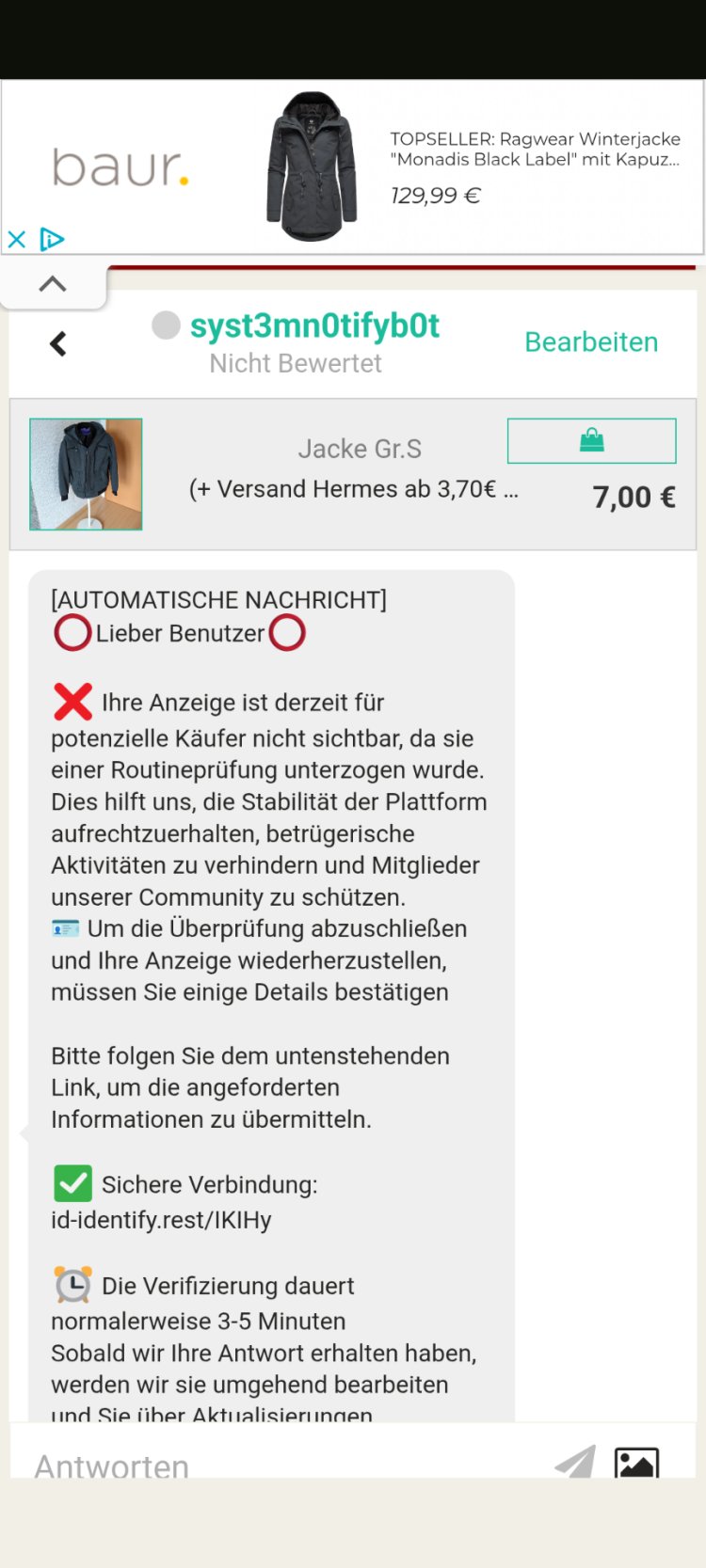 ) und fordert dazu auf, auf einen Betrugslink zu klicken (hab ich natürlich nicht gemacht, sondern die Nachricht gelöscht). Wäre schön, wenn er gesperrt würde.
