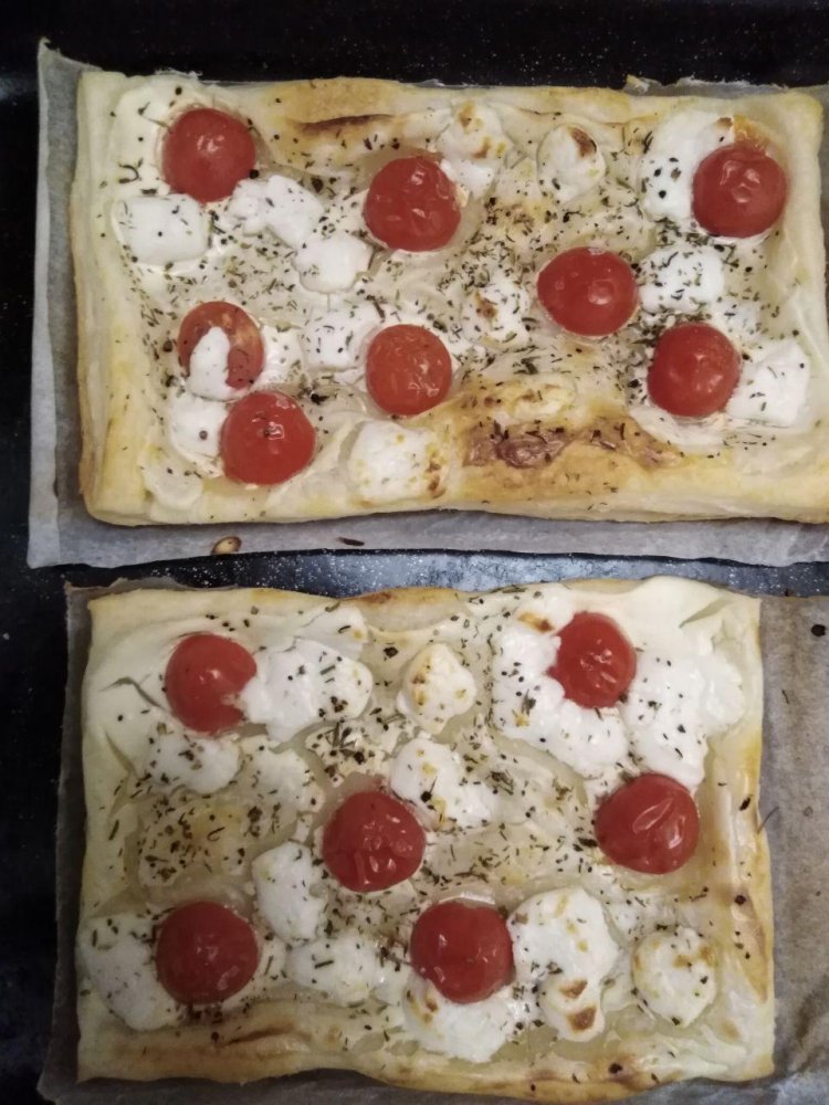 Weil es neulich so lecker war, gab es direkt nochmal Blätterteigpizza mit Ziegenkäse und Kirschtomaten, diesmal auch mit eigenem Bild.