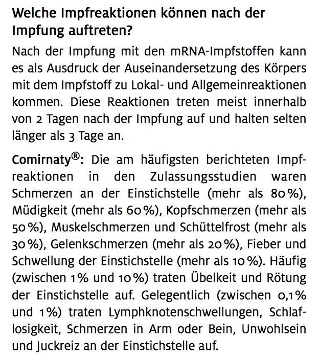 Meine Mutter und meine Schwiegermutter haben Biontech erhalten. Außer Schmerzen im Oberarm hatten beide keine Reaktionen; wobei meine Mutter meinte, dass der Arm generell öfter schmerzt und sie deshalb auch nicht genau sagen kann, ob es an der Impfung lag.