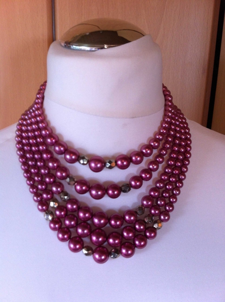 Diese Kette ist Modeschmuck und ein absoluter Hingucker. Ein echtes Statement! 5 Reihen Perlen in zartem Lila mit silbernen Perlen dazwischen. Absolut stylisch und 100% Vintage. Ich trenne mich nur schweren Herzens von Ihr. Deshalb auch kein Tausch.