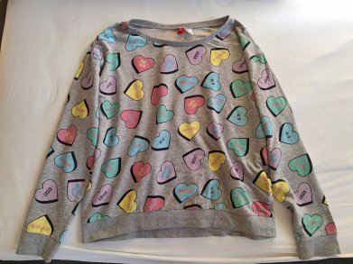 Grauer Pullover mit pastell Herzen mit Beleidigungen, Gr. S