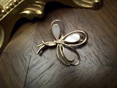 Goldfarbene Anstecknadel mit weissen irisierenden Perlmuttblaettchen....Vintage