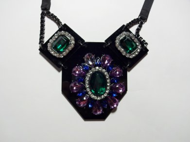 Die blauen, grünen,lila und weißen Glitzersteine sind auf 3 Plastikplatten aufgeklebt und die Kette wird mit einem Band verschlossen. Die Blume auf der auf der Hauptplatte ist leider nicht ganz mittig, wie man auf den Fotos sieht. Zustand ist sehr gut.