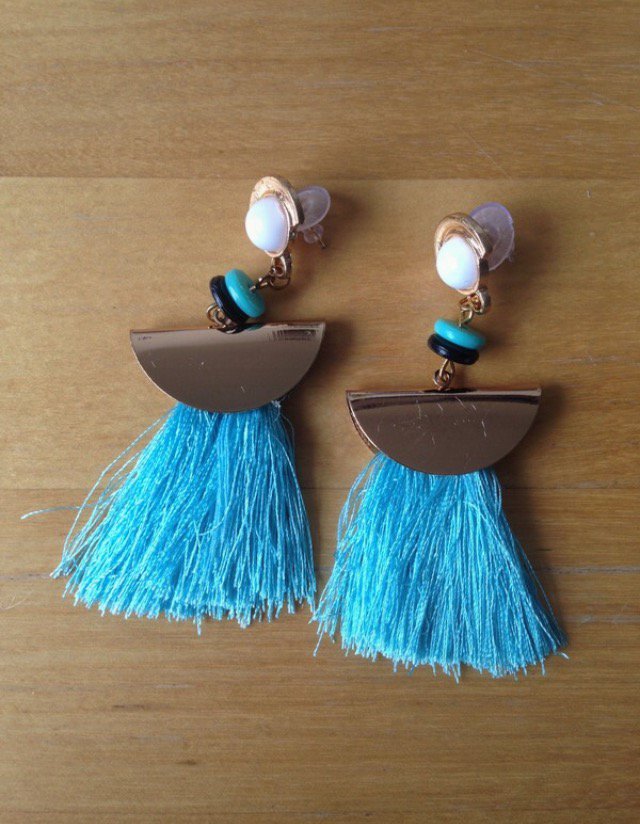 Quastenohrhänger in Türkis und Gold. Länge: 7cm, Breite: 3cm. Nur anprobiert.