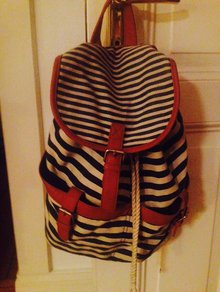 Ich trenne mich von meinem gern getragenen, geräumigen, praktischen und schönen Satchel Rucksack im maritimen Streifenlook der Marke Cooperative - erstanden bei Urban Outfitters, mit Kordel zum Zusammenziehen, verstellbaren Riemen und Magnetverschlüssen, leichtes Waschpeeling am Innenfutter.