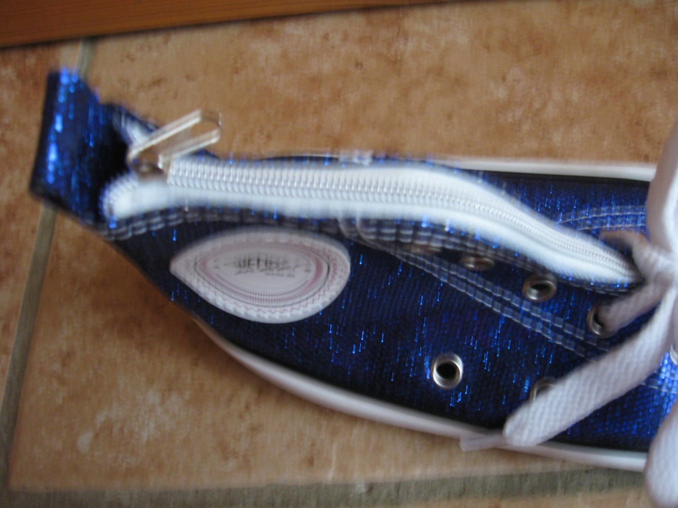 Biete dieses brandneues universell einsetzbares Etui, mit Reißverschluss und Schnürsenkel, witzige Turnschuhform mit viel bling, bling. Die Gesamtlänge beträgt ca. 24cm.