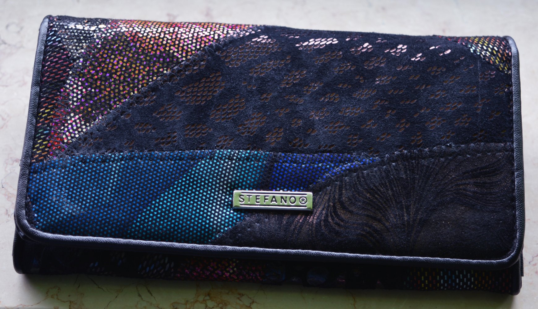 PU Leder schwarz, Wildlederoptik mehrfarbig, 2 Innentaschen, 2 Innentaschen mit Reißverschluss, 10 Kartentaschen, Maße: Breite 19 cm, Höhe 11 cm, Tiefe 2,5 cm, aufgeklappt 19 x 21,5 cm, neu, keine Beschädigungen,