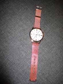 neue schöne uhr aus glänzendem material in einer aussergewöhnlichen farbe - würde sagen so bronze/gold.verstellbar.ohne batterie.