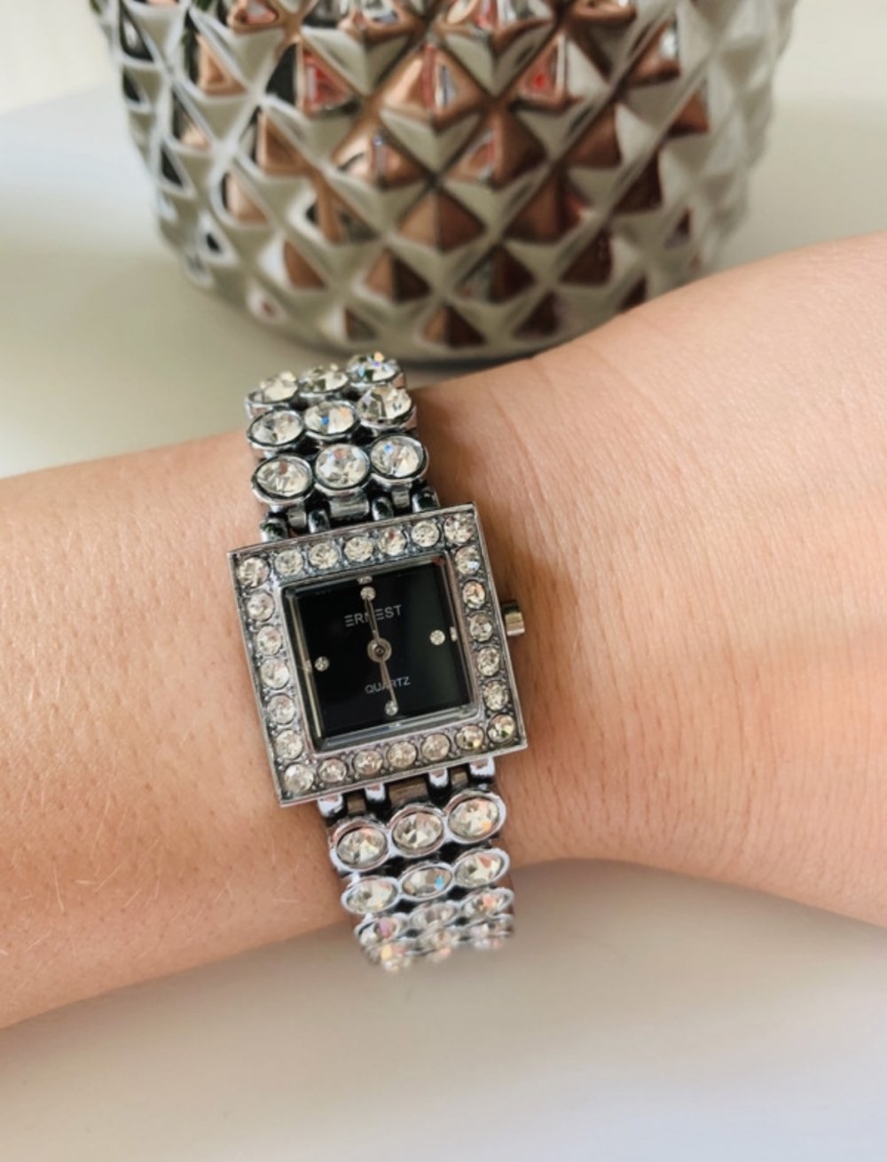 Schöne Armbanduhr Uhr Damen Glitzer Silber Strasssteine Ernest Modeschmuck
