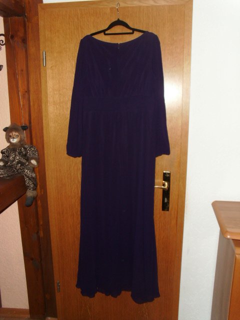 Ich biete hier im Auftrag meiner Freundin ein Abendkleid von Ever Pretty in Größe 40 an. Es ist mit Gr. 3 XL / 46 angegeben, aber es fällt deutlich kleiner aus und wurde in oben genannter Größe getragen. Ich gebe unten noch die Maße an. Das Kleid ist in einem schönen dunklem lila, ich habe einige Fotos überbelichtet damit man die Details besser erkennen kann. Das Kleid ist bodenlang, in einer A-Linie geschnitten und wird auf dem Rücken mit einem Reißverschluss geschlossen. Es ist aus Chiffon, das Kleid ist mit einem blickdichtem Stoff unterlegt, die Ärmel nicht. In der Taille hat es vorn eine Schärperoptik, hinten ist es leicht elastisch gerafft.