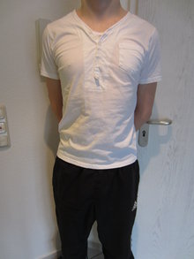 weißes T-Shirt mit V-Ausschnitt und Knöpfen