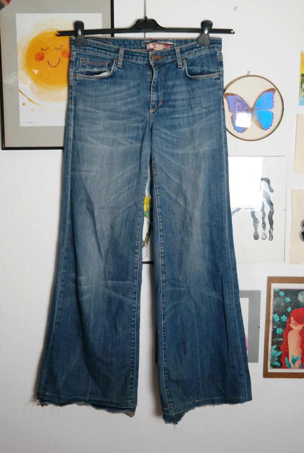 Jeanshose von H&M aus den 00er oder 90er Jahren. Fit Wide. Wurde innen mit einem Bändel versehen, um sie enger schnüren zu können. Von außen nicht sichtbar. Der Saum unten wurde geöffnet, damit sie länger ist. Kleiner schwarzer Fleck am linken Hosenbein. Versand nach Wunsch.