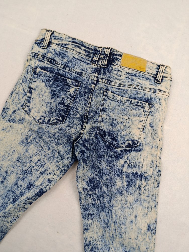 Modische Damenjeans der Marke Pink Woman mit auffälligem Acid-Wash Effekt in Blau-Weiß.