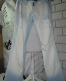 Biete Euch heute eine leichte Jeans von D&G, in der Inchgr.29 an. Sie ist mir leider zu eng geworden. Oben besitzt diese Jeans, einen geraden Schnitt und nach unten wird sie weiter. Die gewollten Löcher, sind nicht mit Stoff unterlegt. An den Gürtelschlaufen befinden sich kleine rote Steinchen. Bei zwei Gürtelschlaufen fehlt ein Steinchen, dies fällt nicht großartig auf. Hier noch einige Maßangaben: