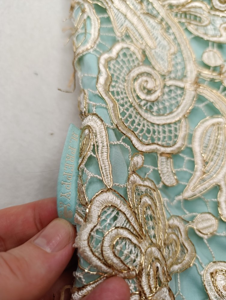 Wunderschönes, elegantes Spitzenkleid in Türkis/Mint mit luxuriöser Goldstickerei