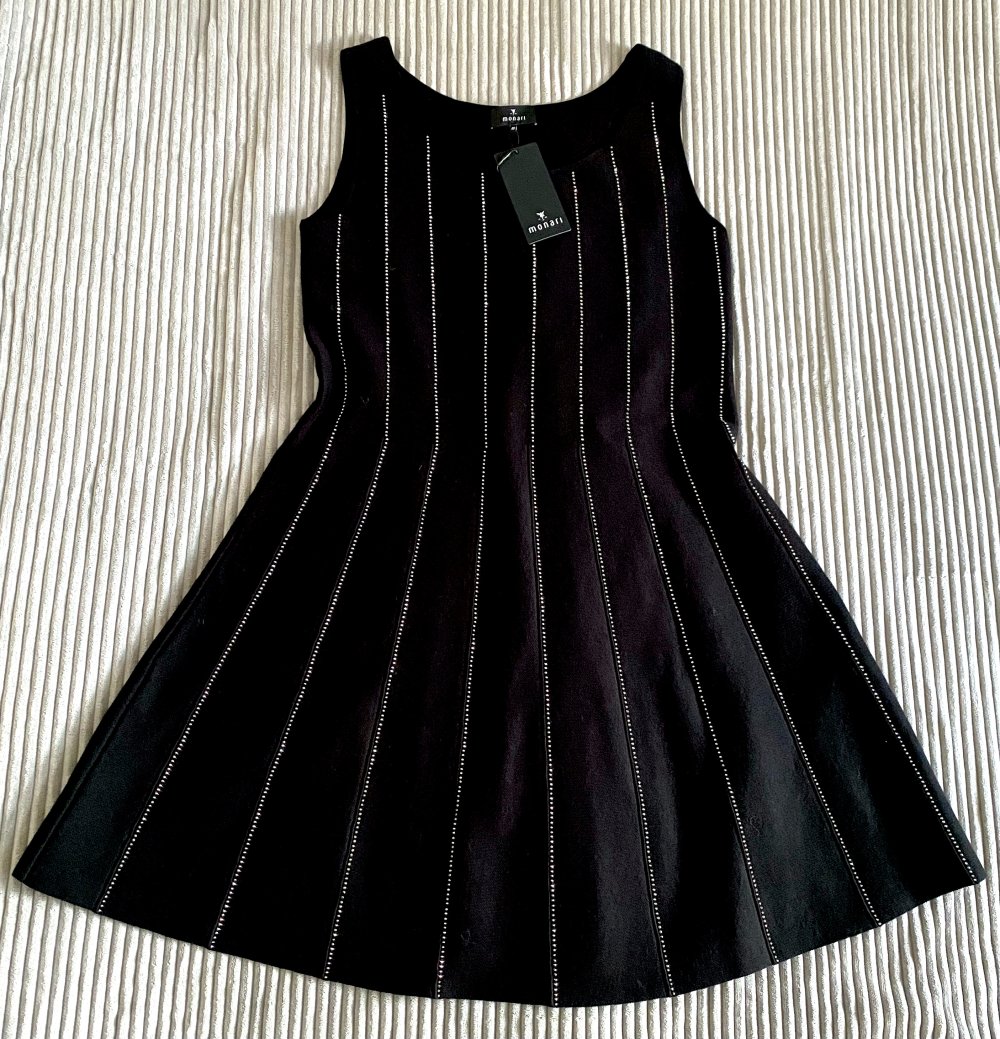 Elegantes Midi-Strickkleid von Monari in klassischem Schwarz. Der glitzernde, taillierte Schnitt in leicht ausgestellter Glöckchenform schmeichelt der Figur und sorgt für einen stilvollen Auftritt. Das ärmellose Design macht das Kleid besonders vielseitig und modern.