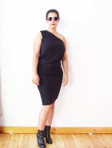 Großartiges schwarzes Bodyconkleid mit Oneshoulder Detail, unterer Teil komplett enganliegend, oberer etwas lockerer. Schlicht gehalten und trotzdem elegant. Stretchiger, super weicher, schön fließender Stoff, schwere Qualität. Elastisches Taillenband, elichte Raffung am Träger.