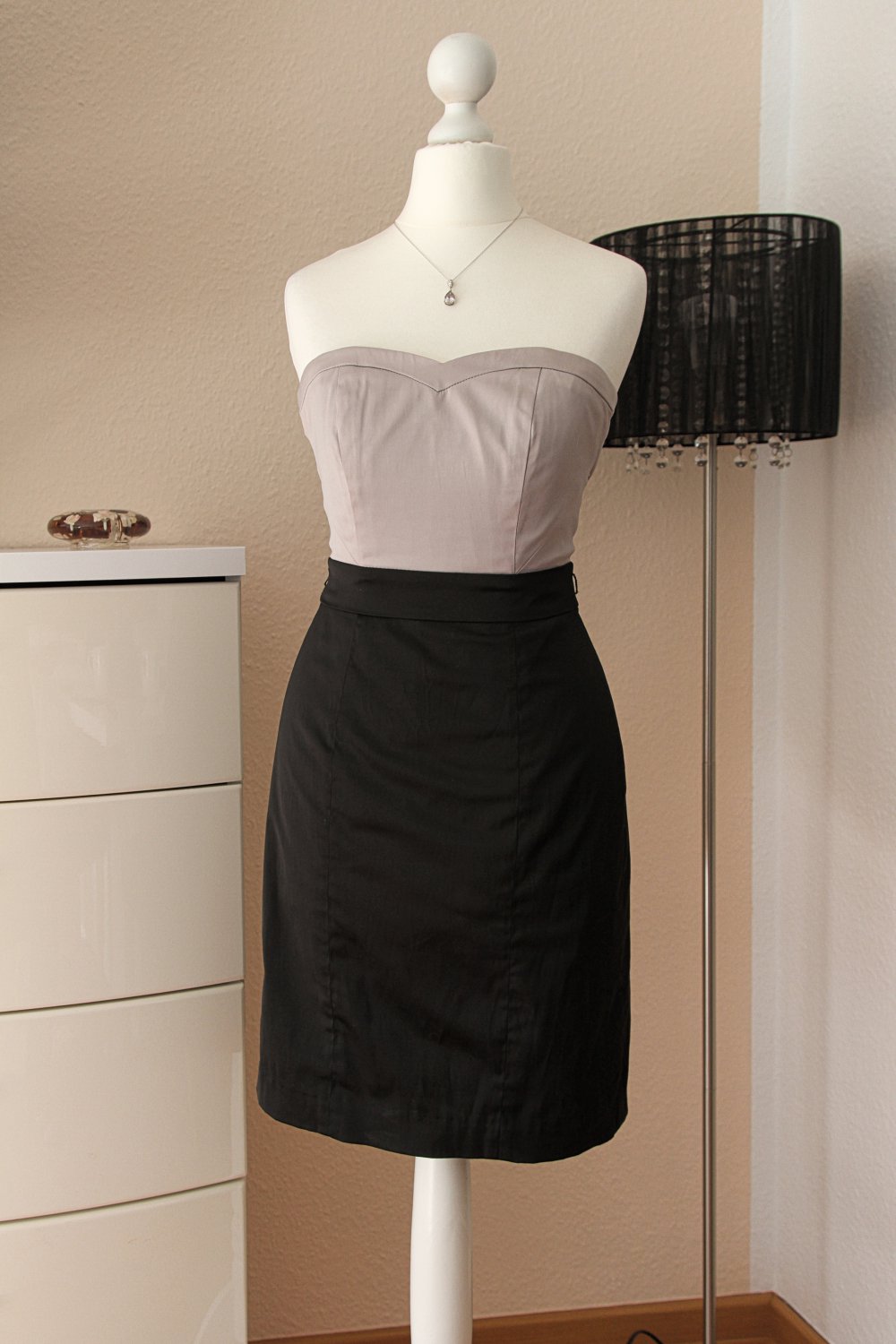 Die Schneiderpuppe trägt Kleidergröße 34/36 (der Reißverschluss hinten ging oben nicht mehr ganz zu bei dieser Größe). Daher empfehle ich eine Kleidergröße 32 oder eine kleine 34.