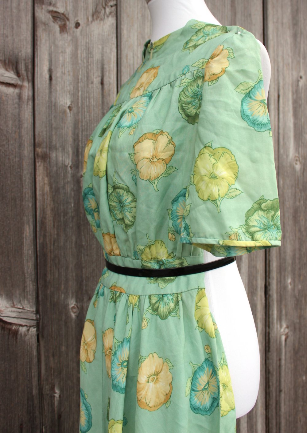 True Vintage, Vintagekleid, Unikat, Einzelstück, selbstgenäht, Blumenmuster, mintgrün, hochgeschlossen, tailliert, weiter Rock, 1950er, Fifties, Rockabilly, Rockabella