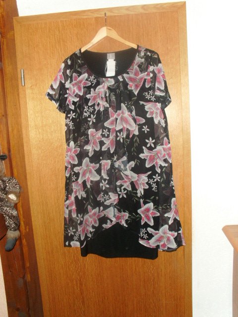 Biete hier ein Sommerkleid von Fair Lady in Größe 40 an. Es handelt sich um ein kurzärmliges Kleid im Lagenlook. Das Unterkleid ist schlicht schwarz und in einer leicht elastischen Stoffqualität. Der obere Stoff ist ebenfalls schwarz, er ist mit rosa-weißen Blüten versehen und leicht transparent. Vorn in einer Wickeloptik. Das Kleid ist aber blickdicht. We ist neu und ungetragen und noch mit Etikett versehen. Es wurde in zwei Größen bestellt und das hier vergessen zurück zu schicken.