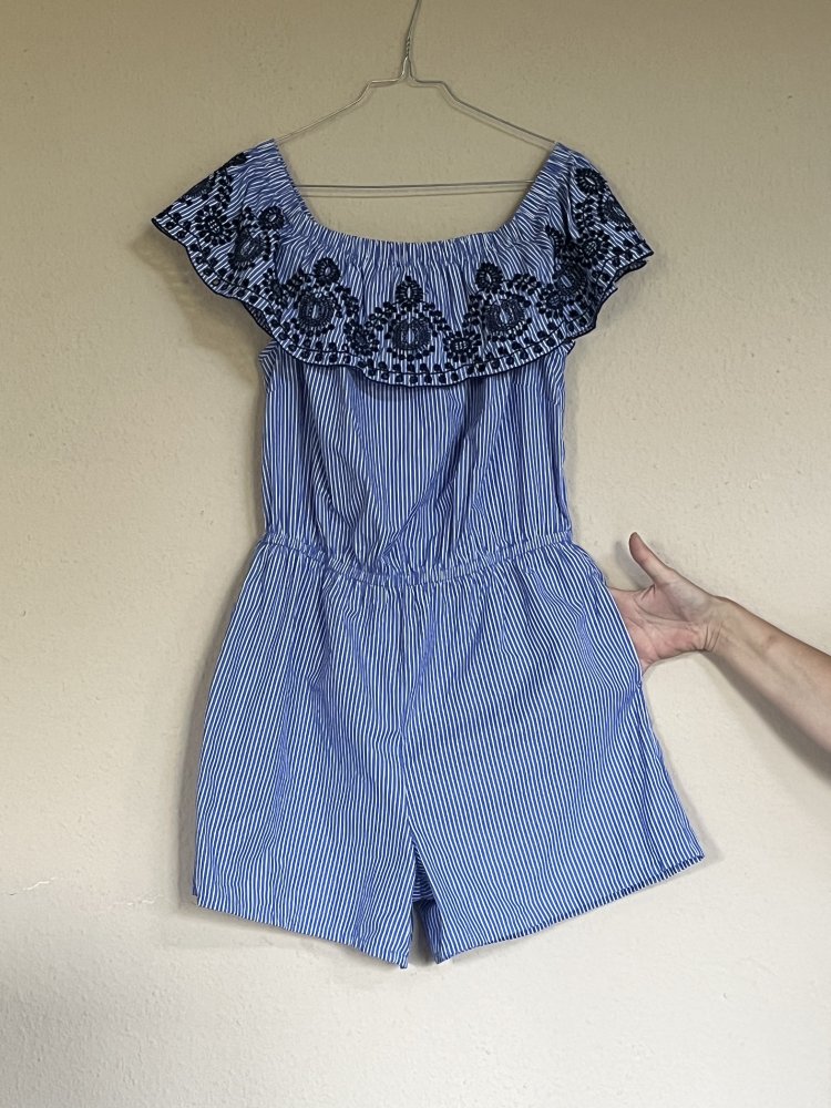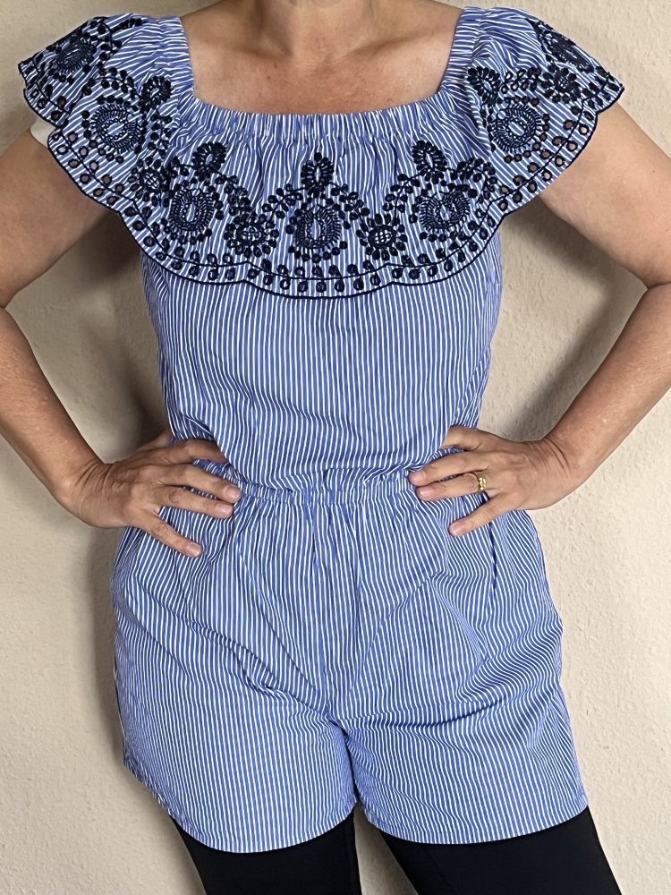 Dorothy Perkins Jumpsuit Gr.42 mit Carmenausschnitt und Stickereien, 2 Seitentaschen, Gummibund Taille und Schulterpartie. Bequem chic und luftig, zart gestreift mit Stickereien ums Dekolte