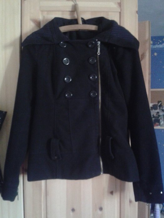 Knöpfe als Verzierung, Reißverschluss an den Ärmeln und vorn zum Zumachen.