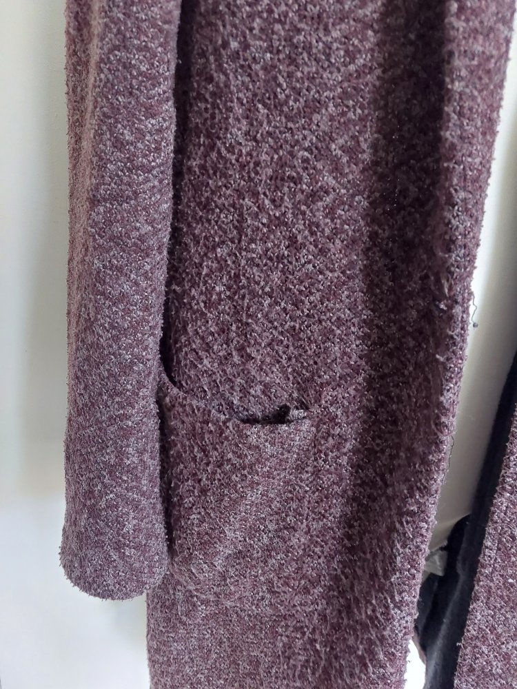 Der Mantel ist lang und hat vorn zwei Taschen :)