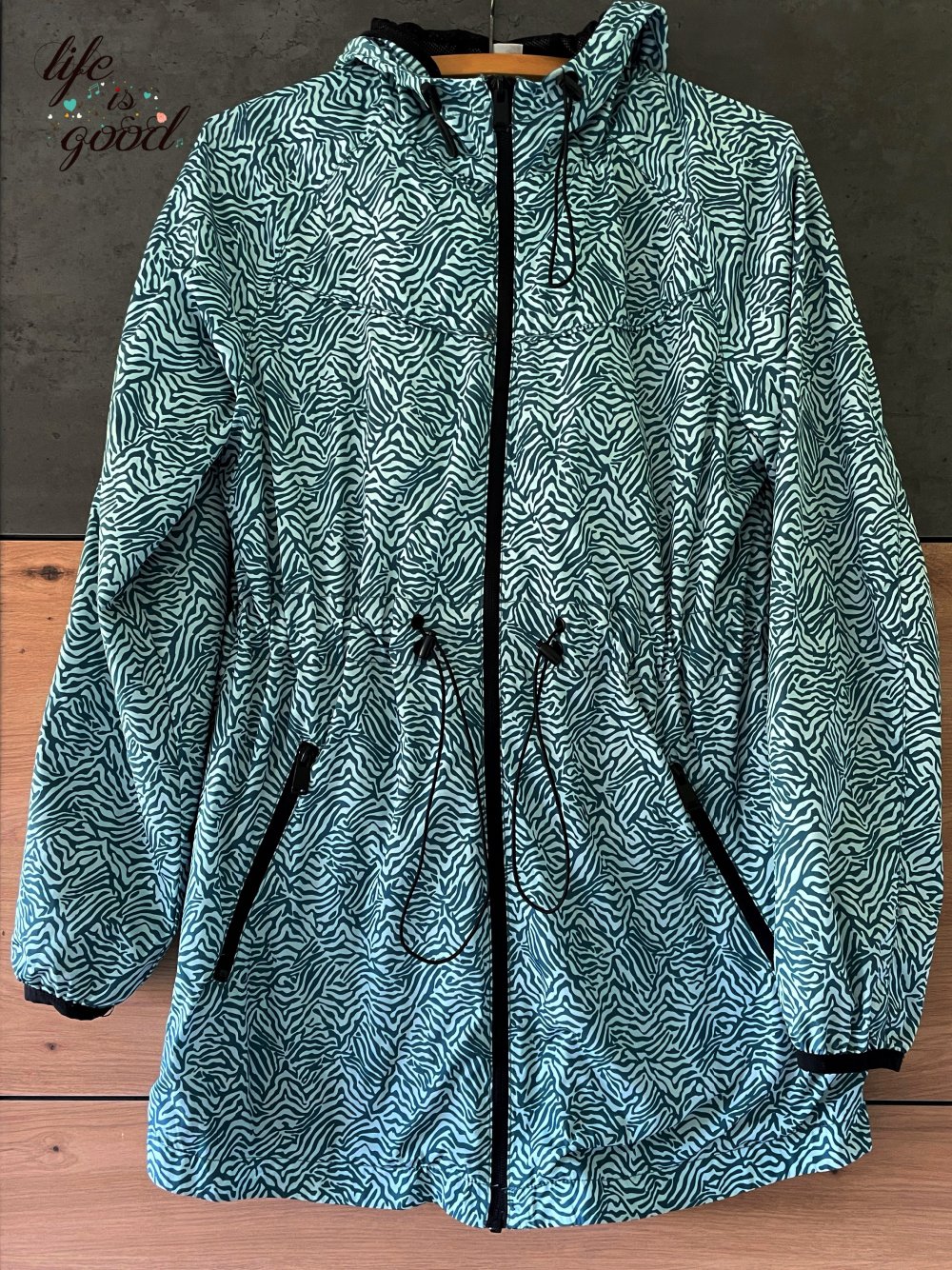 Gebe ein schöne, dünne und leichte Regenjacke ab. Sie kann in der Taille angepasst werden und geht über den Hintern ohne sackig zu wirken.