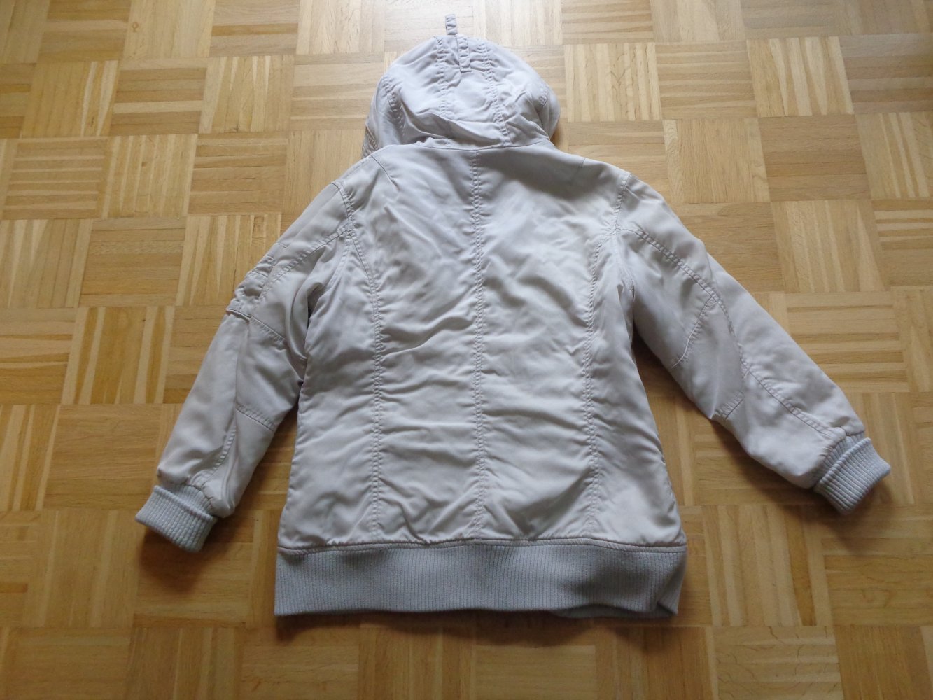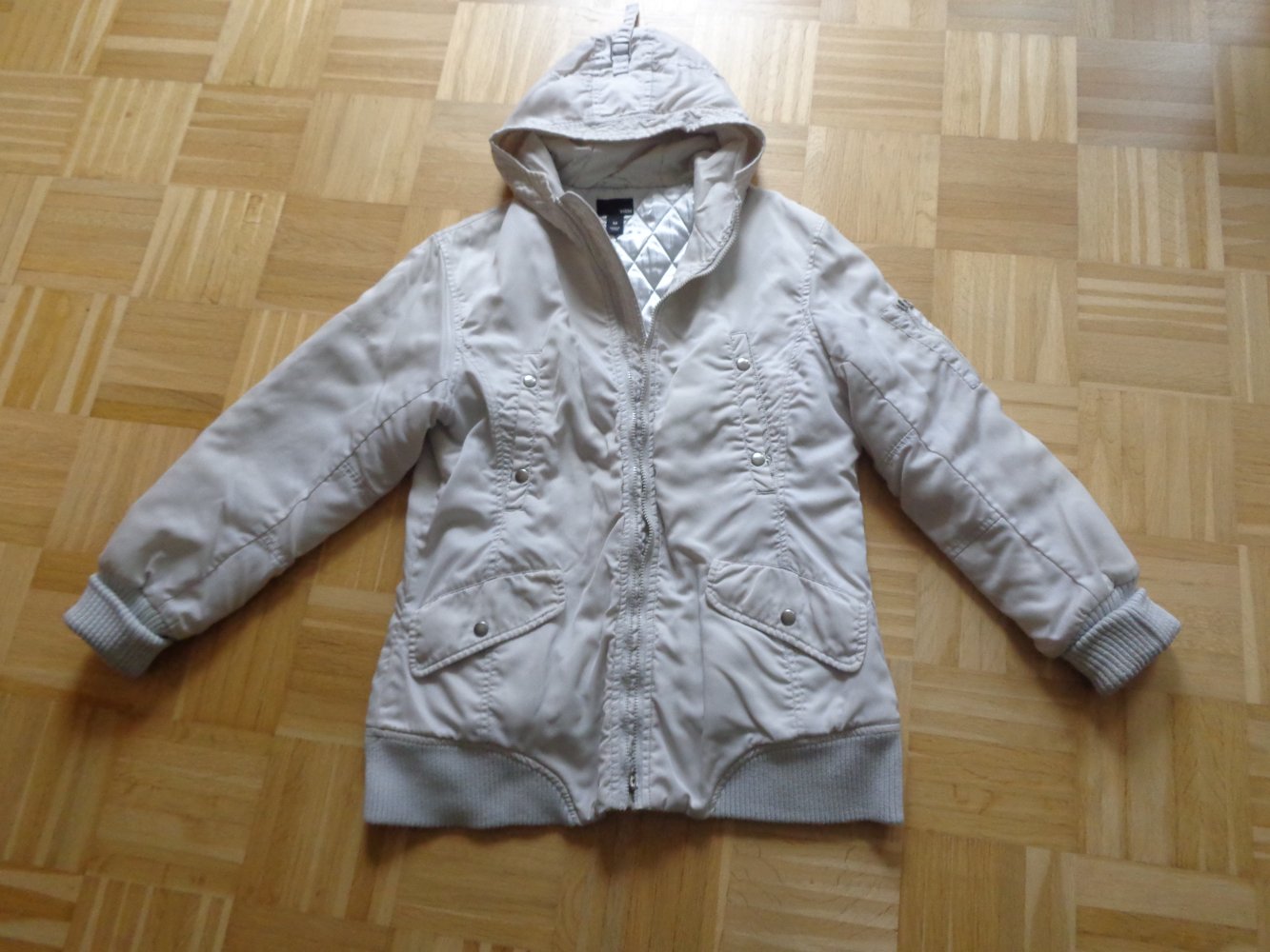 sehr gern getragene Jacke, Gr. M bzw. ca. Gr. 38, H&M, RV, weißgrau, Kapuze (nicht abnehmbar), Steppfutter (hält schön warm), vorn 2 seitliche Brusttaschen mit Druckknöpfen, warmes Innenfutter und 2 Eingrifftaschen mit Druckknöpfen, warmes Innenfutter, Obermaterial 100 % Polyamid, Futter und Wattierung 100 % Polyester, 1 Innentasche mit RV, Länge ca. 71 cm, von Achsel zu Achsel ca. 53 cm, Unterarmlänge ca. 45 cm, übliche normale Trage-Abnutzung, Strickbündchen am Saum und Ärmeln, 17,00 Euro, Versand ca. 5,50 Euro möglich, zeitnahe Antwort, rauch- und tierfreier Haushalt, Privatverkauf, Rücknahme ausgeschlossen (3987 - 3995, nur für mich)