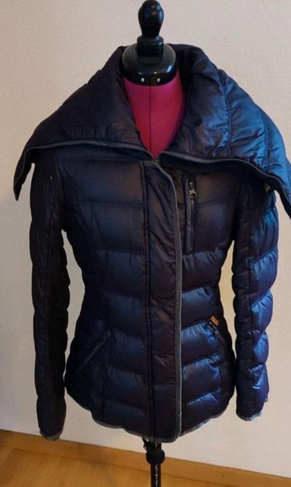 Warme Steppjacke mit großem Kragen und figurbetontem Schnitt. An der Vorderseite am Umschlagband hat sie etwas Pilling, s. Bild. Das kann mit einem Pillingrassierer entfernt werden.