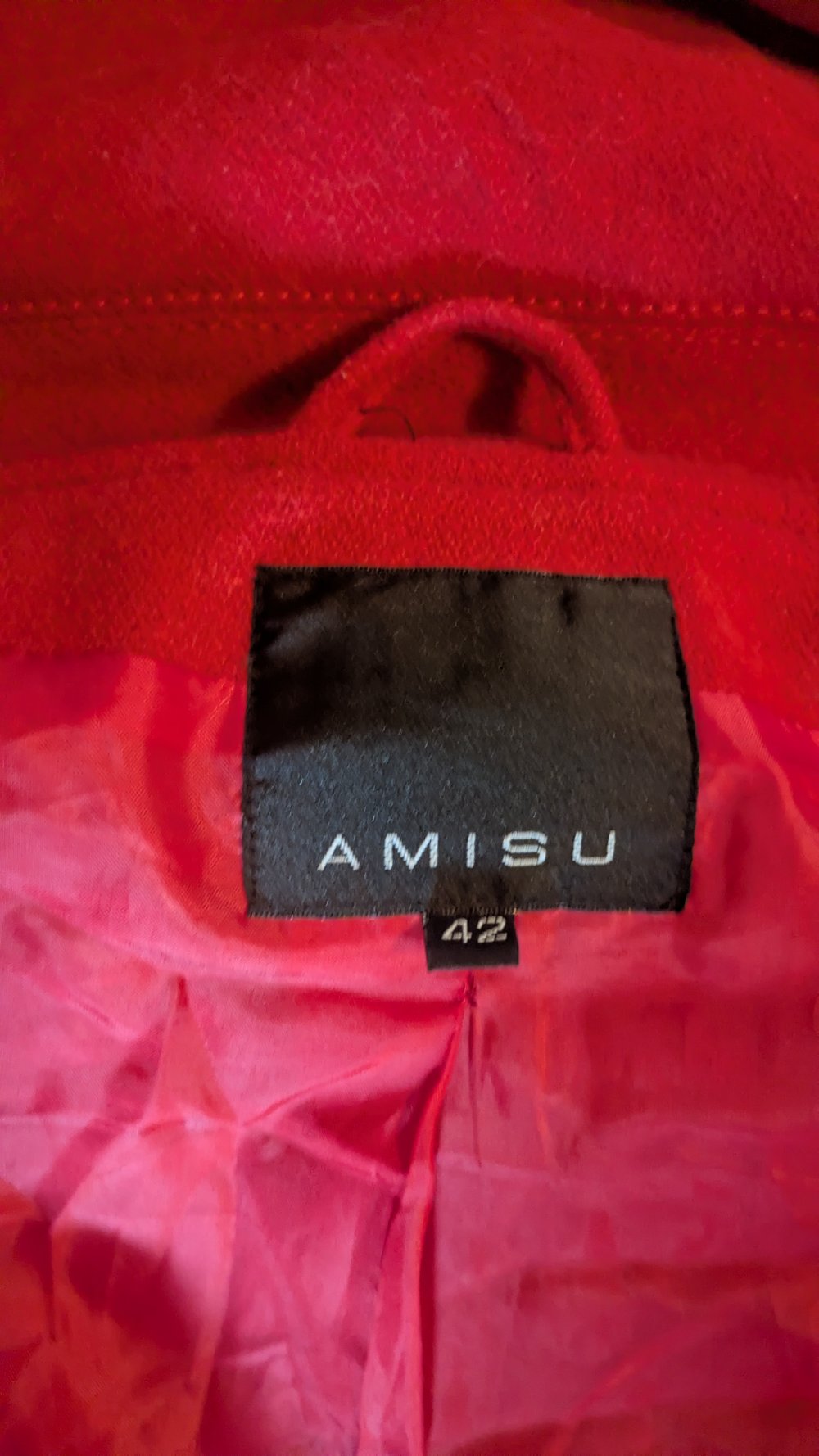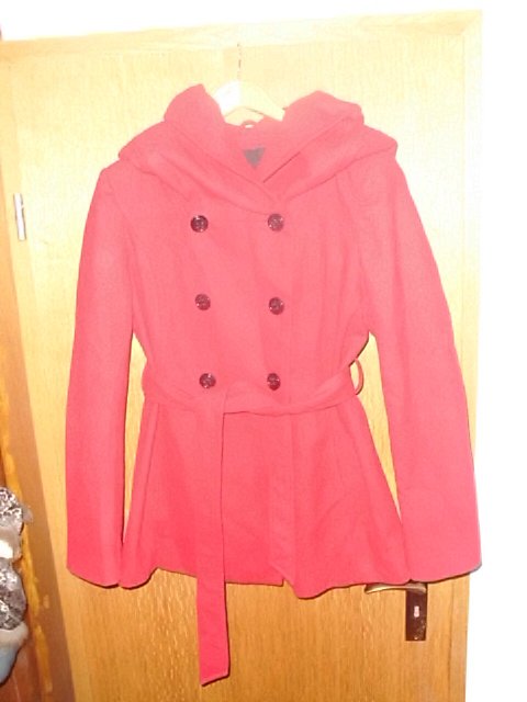 Biete hier eine Jacke von Amisu in Größe 40/42 an. Sie ist mit Gr. 42 angegeben, wurde aber mit Gr. 40/42 getragen. Die Jacke ist knallrot und besteht aus einem Wolle-Viskose-Gemisch mit Polyester. Vorn befinden sich eine Knopfleiste und zwei Taschen. Außerdem hat die Jacke eine Kapuze und in Taillenhöhe ein Bindegürtel. Die Jacke ist ideal für die nicht so kalten Wintertage bis in den Übergang hinein. Sie wurde recht selten getragen und ist sehr gut erhalten.