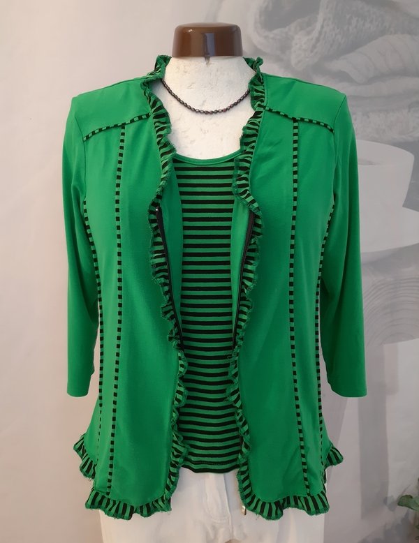 Strickjacke wird mit einem Reißverschluss geschlossen. Größenangabe: 38/40. Ärmel in dreiviertellänge. Passt super zu einer weißen Hose! Material 90% Viscose, 10% Elastan. Rückenlänge Top: ca. 49 cm, Cardigan: ca. 57 cm.
