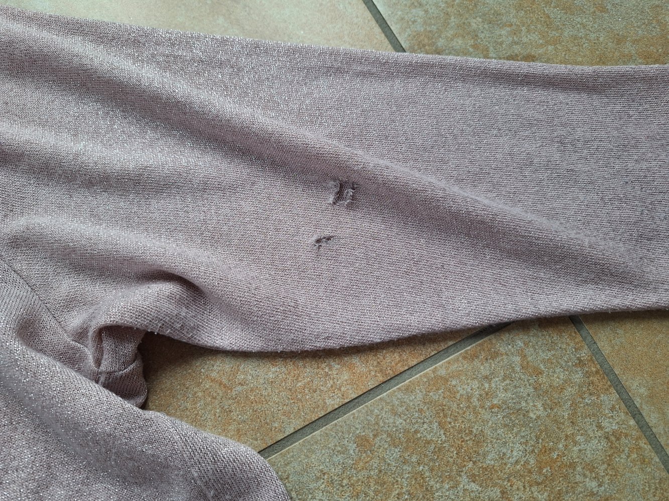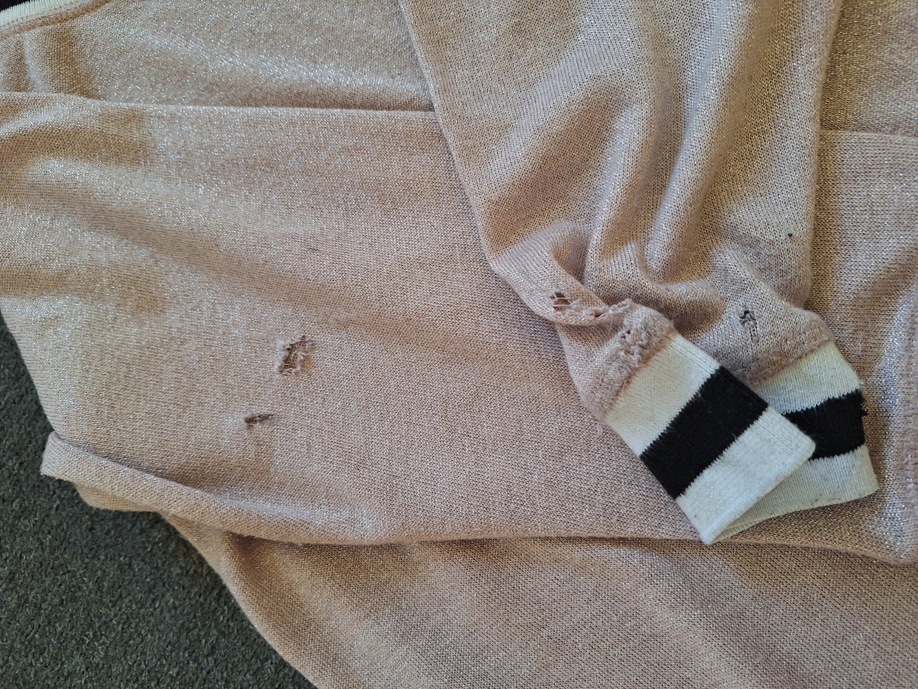 Leider so viel getragen, dass deutliche Gebrauchsspuren, u.a. Löchern an den Ärmeln vorhanden sind, alles abfotografiert.