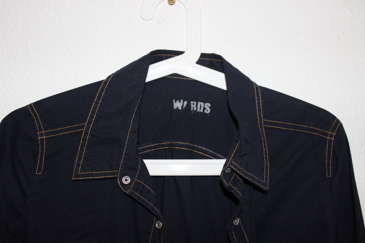 Dunkelblaue Jeansbluse mit braunen Nähten. Vorne befindet sich eine Knopfleiste mit schimmernden Knöpfen. Die Bluse ist schön tailliert geschnitten. Die Etiketten innen wurden entfernt. Es handelt sich um Größe S.