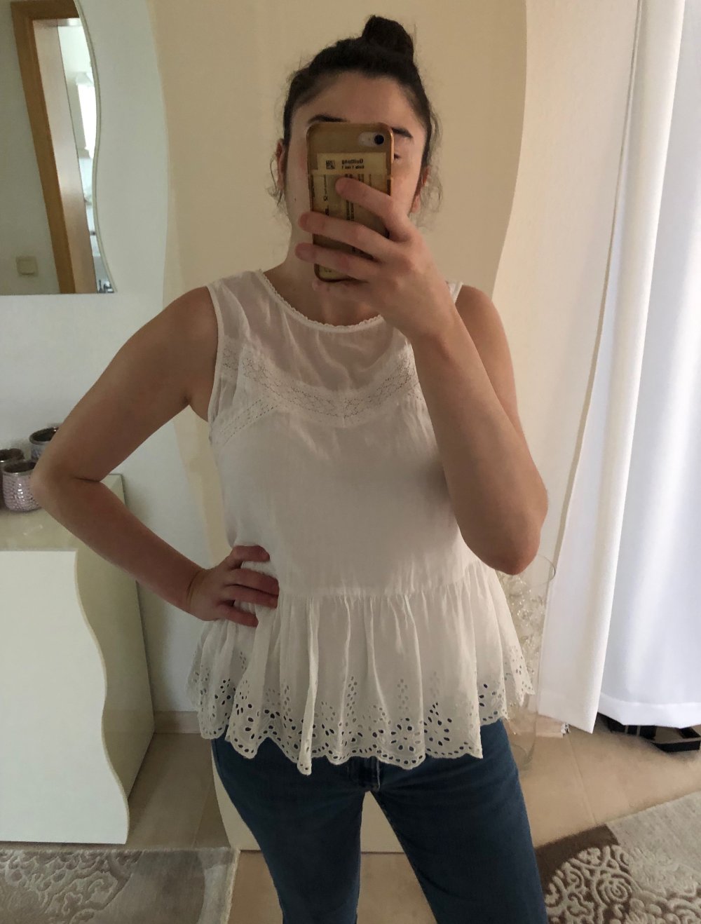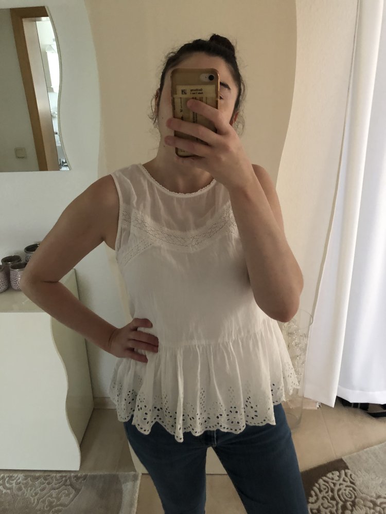 Süße bluse in weiß mit Spitzendetail und lochmuster, die nur einmal getragen wurde. Es ist geschildert mit 40, ich finde es passt eher einer 38. Kann zu einer Jeansjacke, Strickjacke, Bomberjacke, Cardigan, Lederjacke, Bikerjacke oder Jeans kombiniert werden....