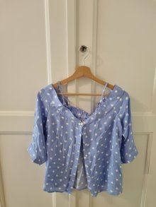 Süsse gepunktete Bluse im 50er-Jahre Stil mit Ellenbogenlagen Ärmel und Spaghettiträgern, daher Schulterfrei.