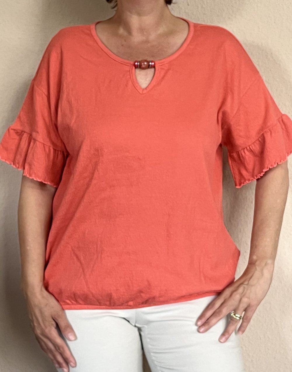 Laura Torelli Kurzarm Bluse mit Samba Ärmeln Gr.L / XL Apricot, mit hübschen Cut Out überm Dekolte und einer Perle