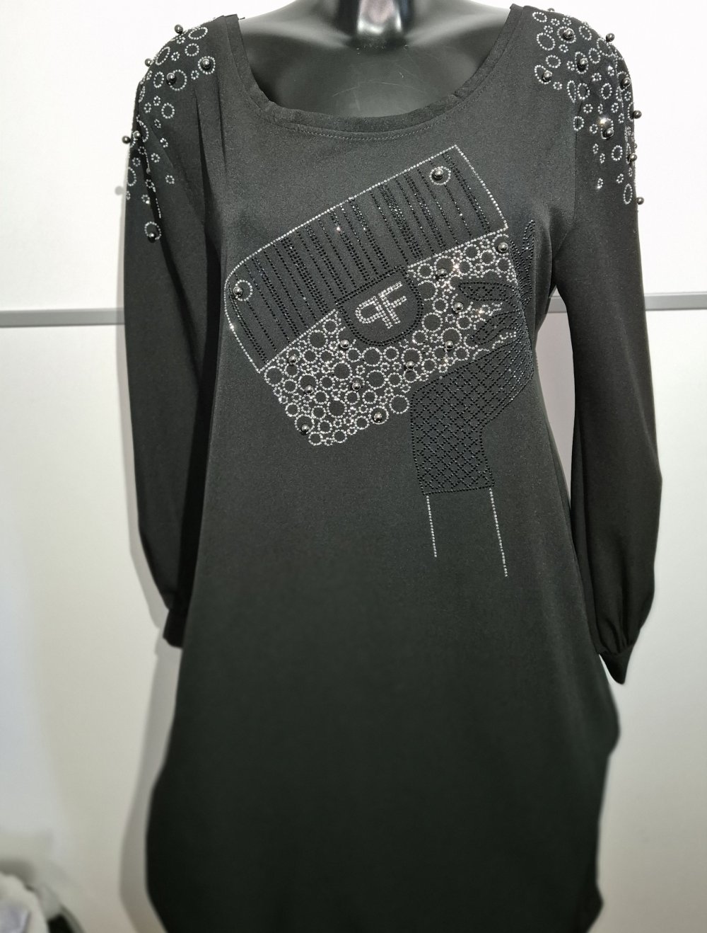 Edle Tunika für den feineren Anlass aber auch im normalen Alltag zu tragen mit vier Bling Bling, hinten ein raffinierten Rücken mit Streifen Schriftzügen und auch viel Strasssteinen versehen, etwas ballonförmig mit kleinen Seitentaschen, ebenfalls ist ein Gürtel dabei um ihn nach hinten oder nach vorne zu bin- den, um die Taille zu betonen wie auf dem Bild, wie man es mag, an den Ärmeln geknüpft nur ein-mal getragen das AA beträgt 53 cm, an den Hüften 75 cm da es sich ja um einen Ballonschnitt handelt. Gesamtlänge 96 cm. Auch die großen Perlen sind qualitativ sehr hoch verarbeitet mit Nieten, dementsprechend gehen die auch nicht ab.