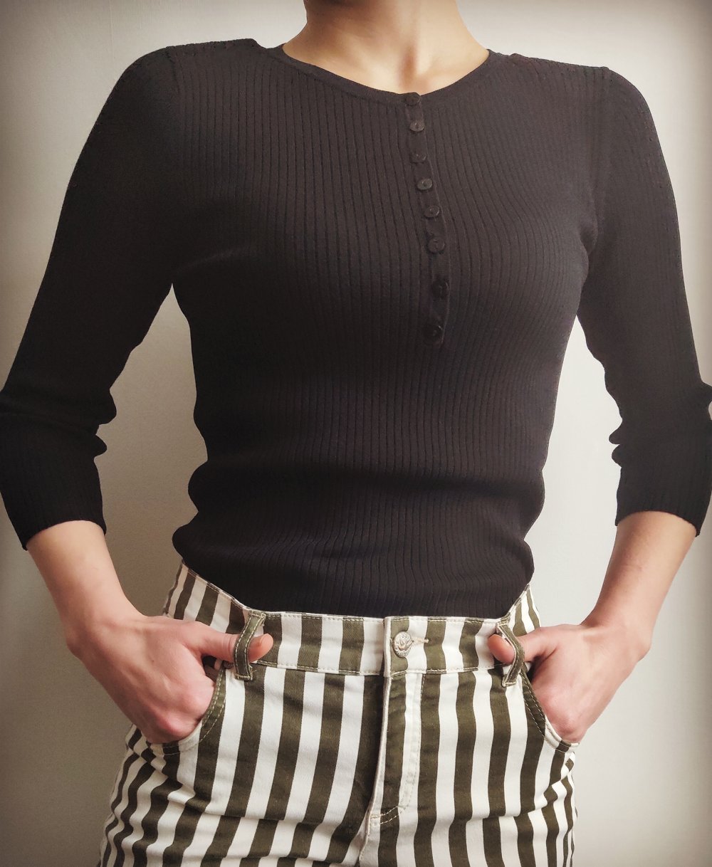 Ein klassisches, eng anliegendes Langarmshirt der Marke Marks & Spencer. Das Shirt ist in Schwarz gehalten und hat eine schöne, vertikale Rippenstruktur. Es verfügt über eine Knopfleiste (Henley-Stil) am Ausschnitt. Dank des hohen Viskoseanteils ist der Stoff besonders weich und fließend.