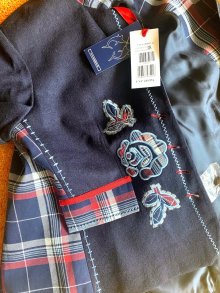 Vorne lässt sie sich mit einem Bindeband sowie fünf schimmernden Perlmuttknöpfen schließen. Zwei kleine Taschen auf der Vorderseite sowie ein Deko-Blümchen auf Brusthöhe setzen charmante Akzente – ein echtes Highlight!