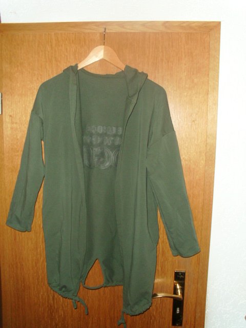 Biete hier einen langen Cardigan in Größe 42 an. Er ist khaki und besteht aus 95% Baumwolle und 5% Elasthan. Der Cardigan hat keine Knöpfe und wird somit offen getragen. Im unteren Bund befindet sich ein Zugband und er hat eine feste Kapuze. Außerdem hat er zwei seitliche Taschen. Auf der Rückseite befindet sich ein Schriftzug Ton im Ton. Der Cardigan wurde nur selten getragen und ist sehr gut erhalten.