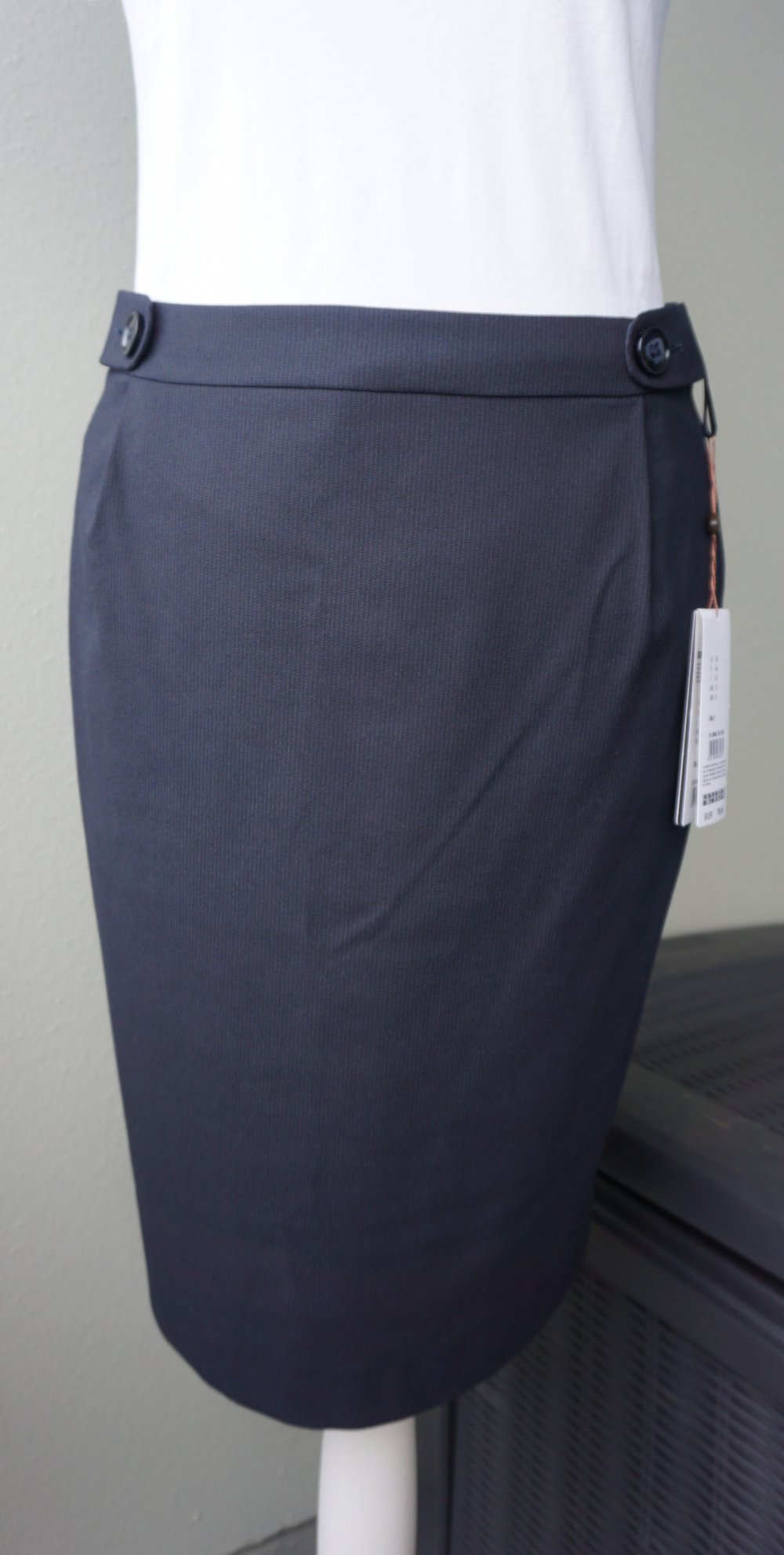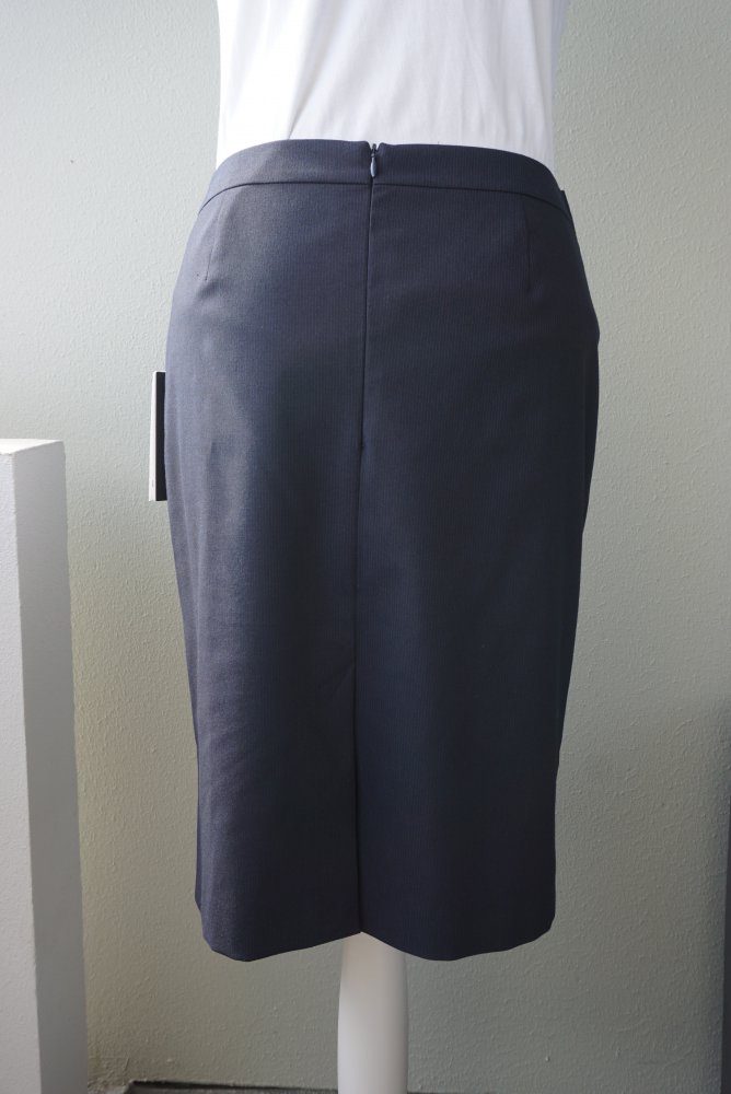 Neuer, sehr schicker (Business-) Rock von selection by s.oliver in Größe 38, Länge ca. 58 cm. Tiefes Dunkelblau / anthrazit mit kleinen Nadelstreifen. Hinten ein Reißverschluss und eine Gehfalte unten, mit Innenfutter, Vorne sind zwei Knöpfe angebracht, ein Ersatzknopf ist noch am Etikett.