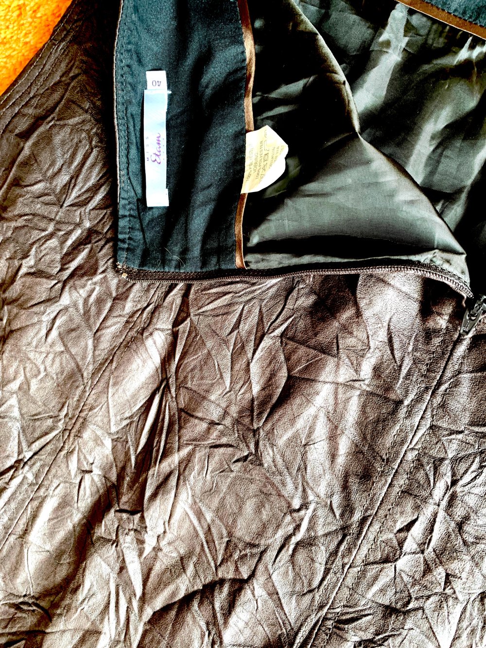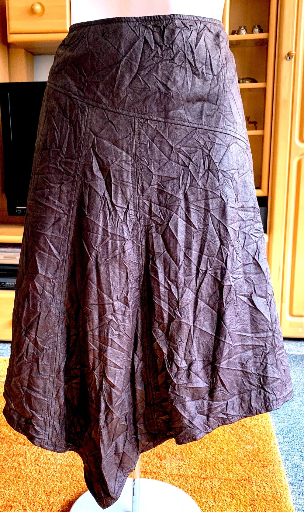 Ein außergewöhnlicher und hochwertiger Rock im verspielt ausgestellten Zipfel-Design von Miss Etam. Der Rock ist aufwendig gearbeitet, besitzt eine schöne Crash-Struktur und fällt in einer sanften Glockenform, die beim Tragen besonders lebendig wirkt. Durch sein feines, weiches Material fühlt er sich fast wie zartes Leder an – sehr angenehm auf der Haut.