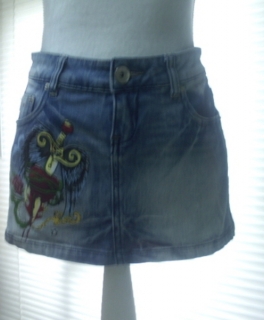 Nagelneuer Jeansmini,in der Gr.S(34/36),mit einer auffälligen Aufmachung,er besitzt vorne links und hinter rechts,auf der Gesäßtasche,einen auffälligen Druck,mit vereinzelten Pailetten und kleinen Straßsteinchen.Hier noch einige Maßangaben:
