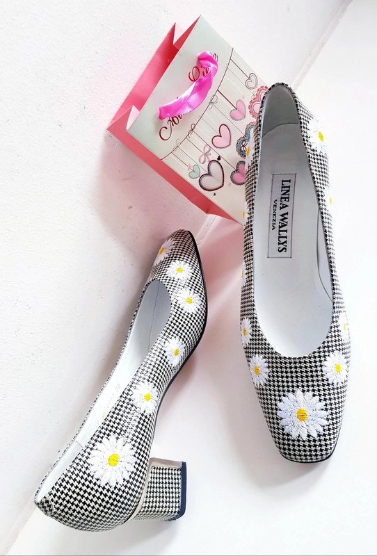 Ein wunderschöner, eleganter hochwertiger Pumps. Das schöne Blumenmotiv mit den edel Karo schwarz-weiß, und der Absatz außen in Karo und außen und innen in Silber gehaltene Basislage lässt jedes Outfit strahlen.