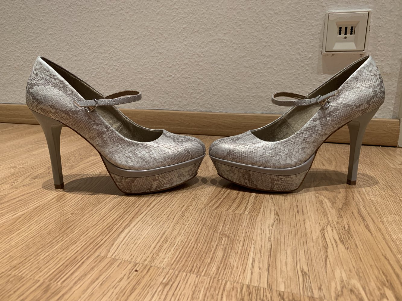 Besondere Plateaupumps von Tamaris in weiß/grau/Silber und Schlangenmuster; der Absatz hat einen schönen grauen Lack. Die Pumps wurden kaum getragen.