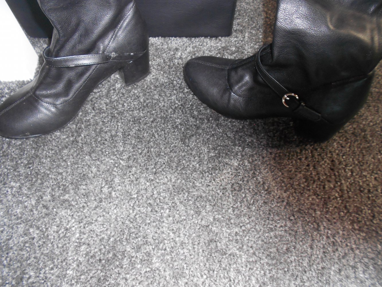 Schwarze Overkneestiefel mit runder Spitze und dekorativem Riemen in gebrauchtem, aber sehr gutem zustand mit leichten Abnutzungen am Absatz. Die Stiefel sind aus Lederimitat. Absatzhöhe: 5 cm, Schafthöhe: 50 cm, Schaftweite (Durchmesser): 16 cm