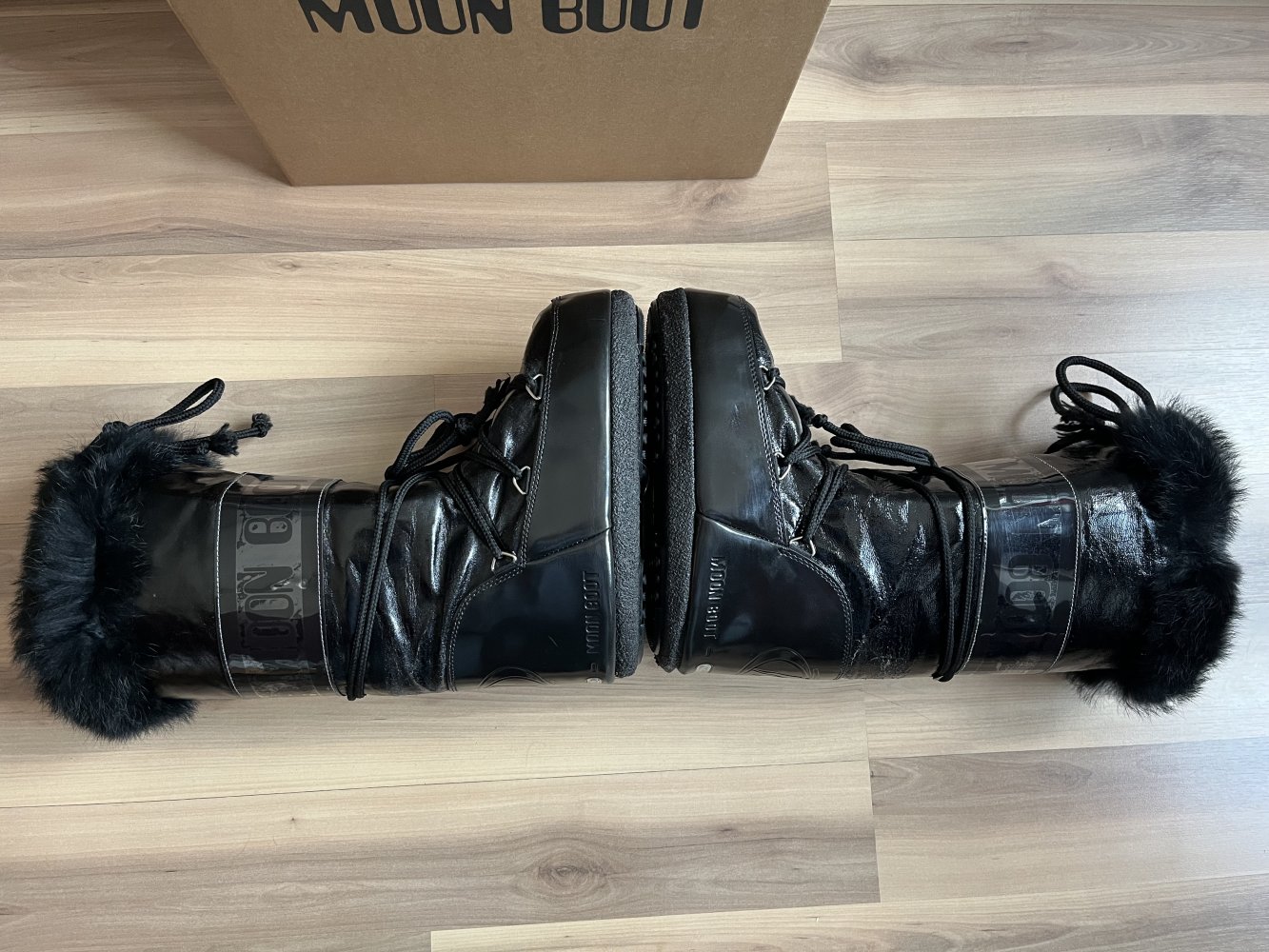 Schwarze Moon Boots in Lackoptik aus der Fashion Linie von Tecnica mit Fell am Schaftrand.