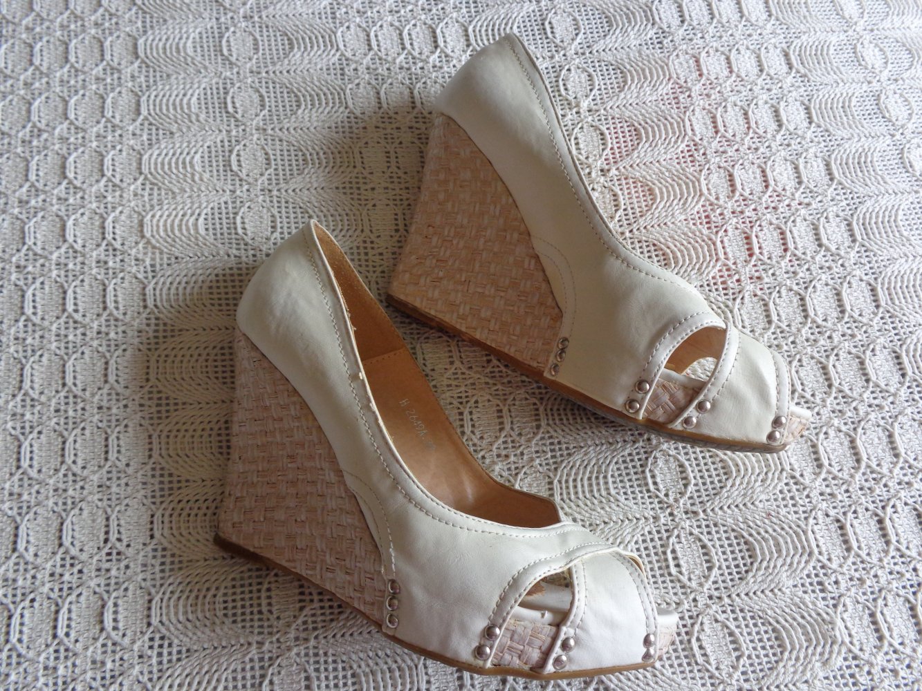Keil-Peeptoes, Gr. 39, ecru, vermutlich Kunstleder, normale Gebrauchsspuren, wenig getragen, Absatzhöhe gesamt ca. 10,5 cm, an dem rechten Schuh ist an der Innenseite der Klebstoff etwas zu sehen (schon so gekauft), in der Farbe haben sie sich etwas verändert, ganz leicht scheckig, (gleiche habe ich auch in hummerfarben für 17,00 Euro), 15,00 Euro, Versand 5,00 Euro möglich, zeitnahe Antwort, Privatverkauf, Rücknahme ausgeschlossen (2030 - 2035, nur für mich)