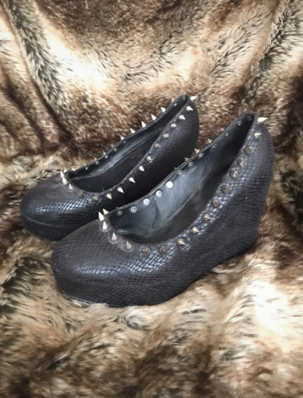 Es handelt sich um Plateauschuhe , die mit einem weichen Stoff in Schlangenoptik überzogen ist (siehe letztes Bild). Umlaufend sind silberne Nieten angebracht
